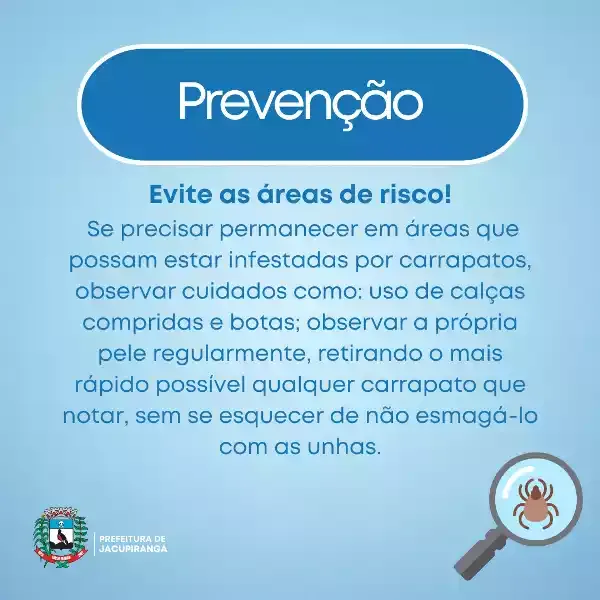 Nessa segunda feira, dia 18/09, a Prefeitura Municipal de Jacupiranga dará início a Semana de Mobilização Contra a Febre Maculosa Brasileira, doença transmitida pelo carrapato Amblyomma aureolatum (carrapato-estrela, carrapato- amarelo- do- cão), encontrado em cães e gatos que convivem ou frequentam matas.
